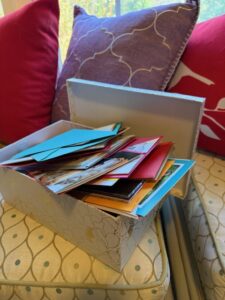 Believe it or not, I have kept every Christmas card that someone has sent me. When I pull out the Xmas decorations, I open the box of past received Xmas cards and take a sentimental journey. I think it’s a way of honoring folks who have been in your life and took the time to send you a heartfelt season’s greetings. Someday my kids will find the box, wonder what the hell was wrong with Mom and pitch them, but until that day comes, I’ll continue my personal tradition.